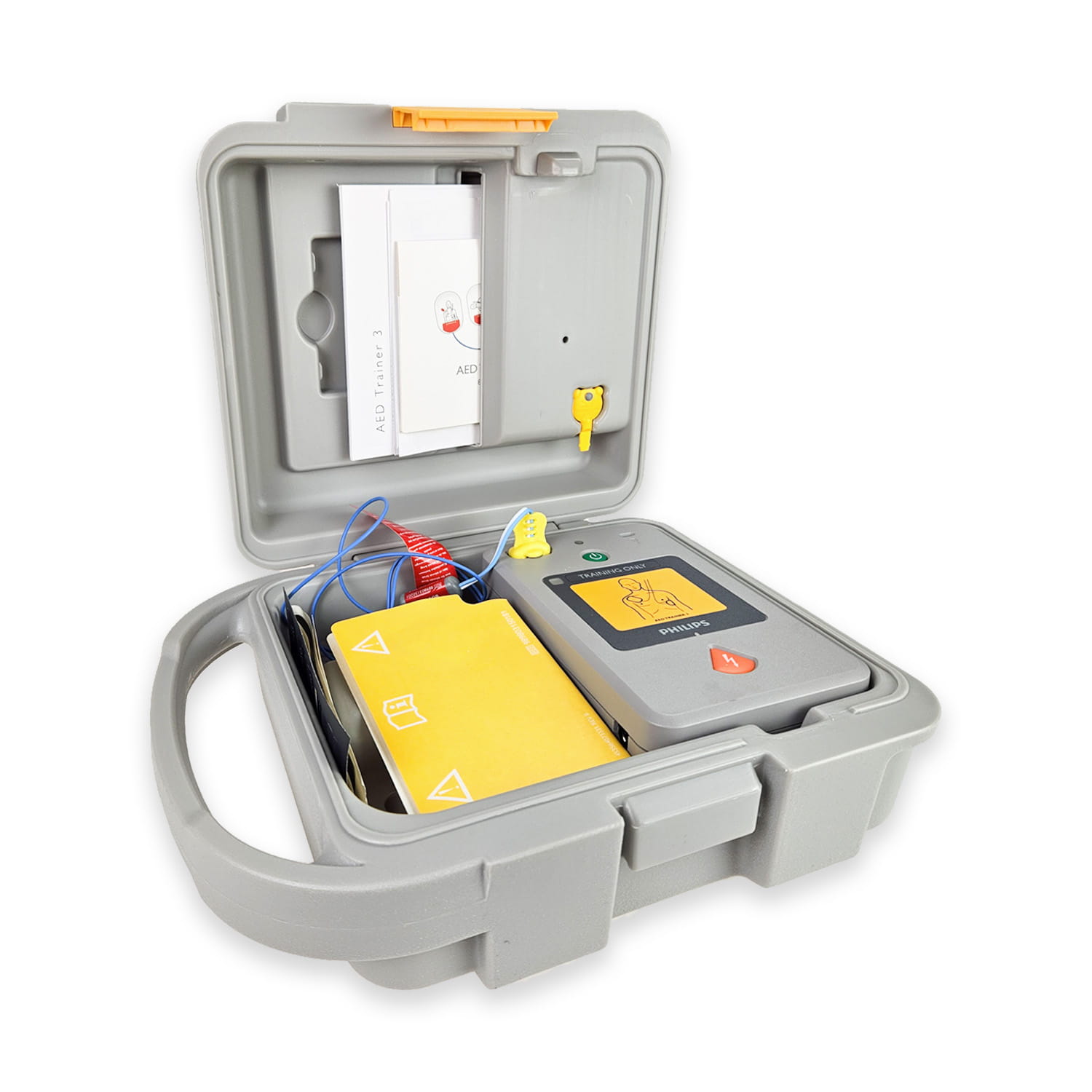 W zestawie AED Trainer 3 znajdziesz wszystko, co potrzebne do skutecznego szkolenia. Oprócz urządzenia defibrylatora, otrzymasz futerał przenośny, klucz niemowlęcia/dziecka, zewnętrzny adapter manekina, kartę SD z systemem operacyjnym i programem konfiguracyjnym, przewód podłączeniowy elektrod oraz zestaw wielorazowych elektrod treningowych HeartStart Training Pads III. W komplecie jest także instrukcja obsługi oraz zestaw naklejek "Training Only". Opcjonalnie dostępny jest pilot zdalnego sterowania, który można dokupić oddzielnie.