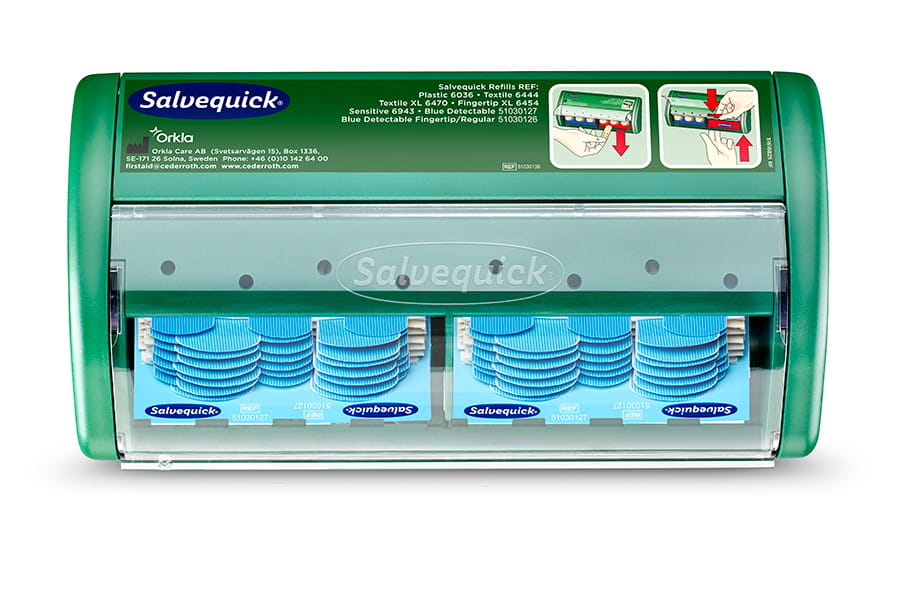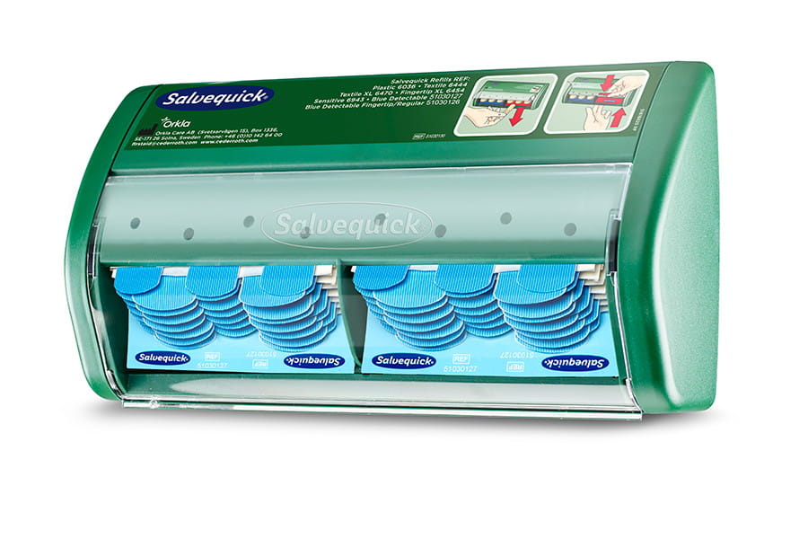 Automat z plastrami opatrunkowymi wykrywalnymi Salvequick Blue Detectable Cederroth REF 51030130 to bardzo wygodne urządzenie służące do szybkiego dozowania plastrów. Produkt standardowo wyposażony jest w plastry Salvequick Blue Detectable. Plastikowa klapka zabezpiecza zawartość przed czynnikami zewnętrznymi i gwarantuje sterylność umieszczonych wewnątrz środków medycznych. Plastry opatrunkowe wyciąga się z dozownika jedną ręką ciągnąc ku dołowi, po wyciągnięciu plastra, jedna jego cześć z klejem jest już odkryta co oznacza, że można go od razu użyć. Taki system pozwala uniknąć zanieczyszczenia lub zakrwawienia pozostałych plastrów. Plastry są wykrywalne przez wykrywacze metalu a dzięki niebieskiemu kolorowi łatwo je zauważyć. Polecane do użytku w zakładach produkcji i przetwórstwa żywności, w celu zmniejszenia ryzyka zanieczyszczenia żywności.