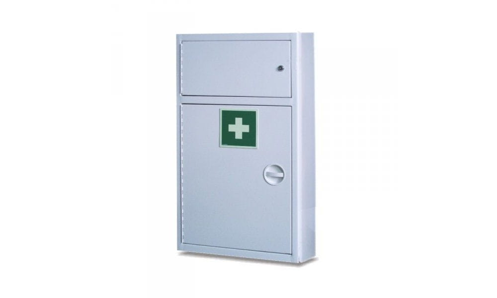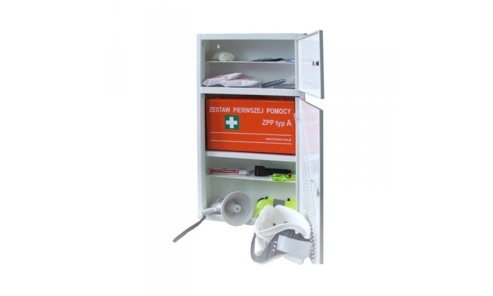 Na drzwiach umieszczono piktogramy, które informują pracowników o zawartości szafy, a także zielony krzyż.