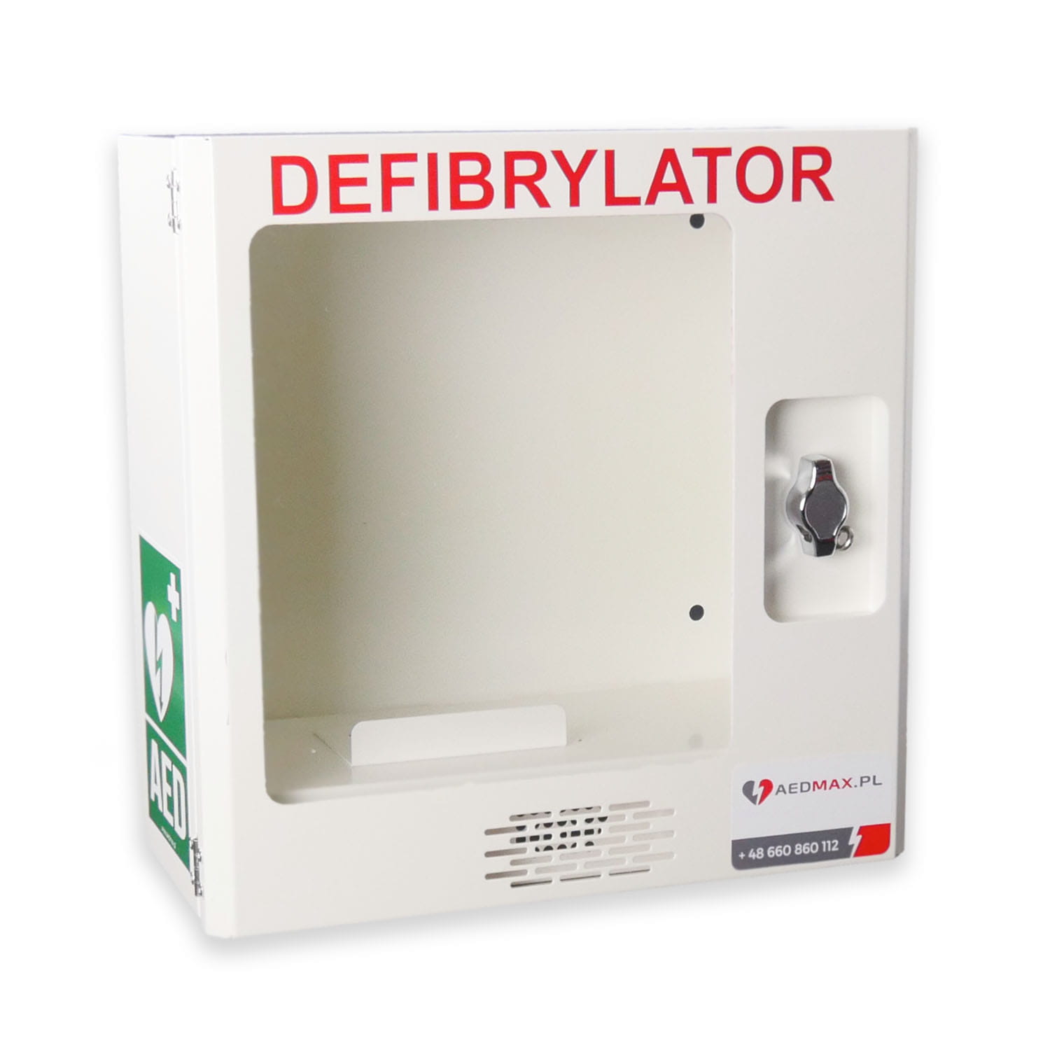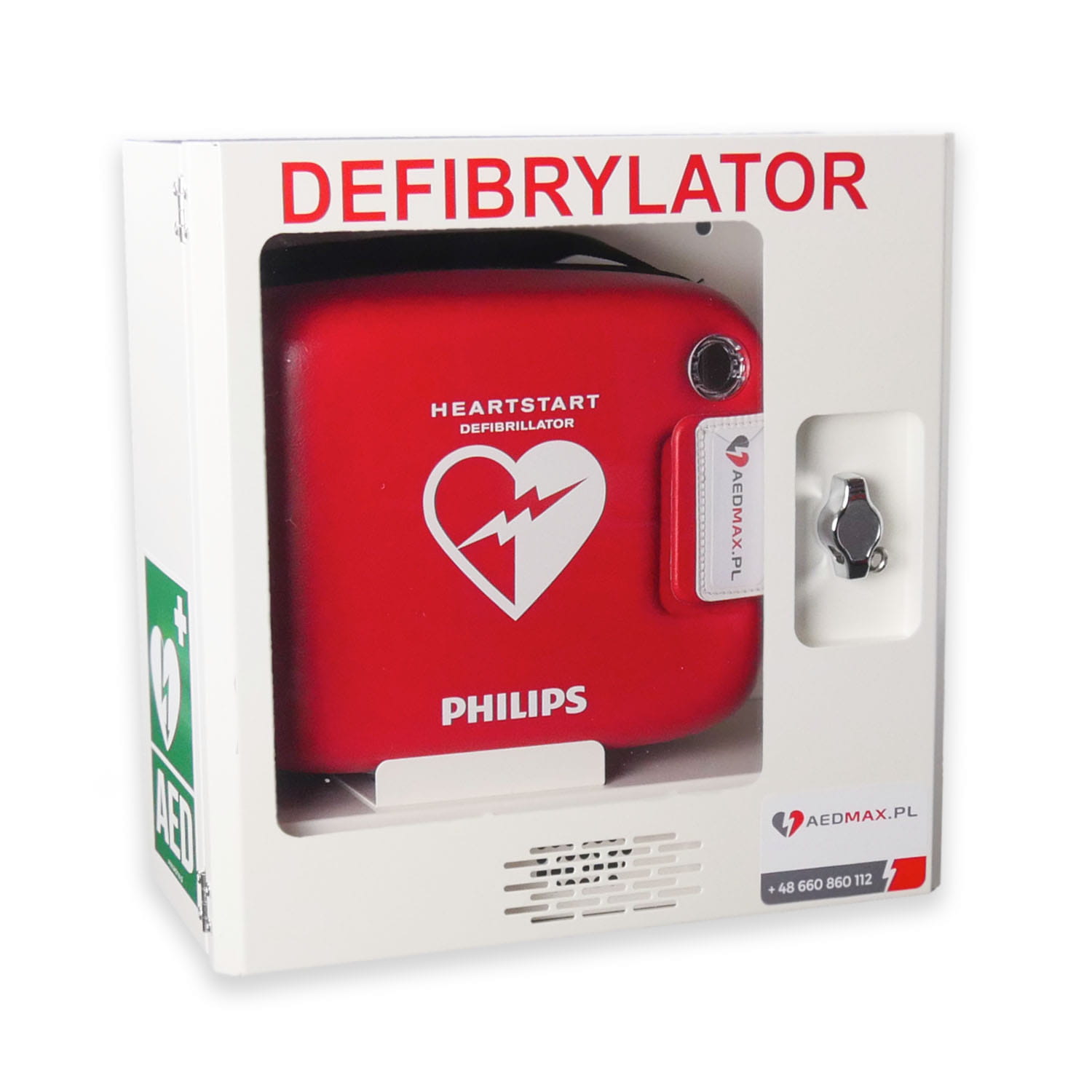 Do zestawu dołączona jest metalowa szafka na AED, która jest idealnym rozwiązaniem do przechowywania defibrylatora. Szafka posiada obszerne wnętrze, które pozwala na umieszczenie niemal wszystkich dostępnych modeli AED na polskim rynku. Jest wytrzymała, estetyczna i posiada duże przeszklenie na drzwiczkach, umożliwiające łatwy podgląd umieszczonego w niej urządzenia. Doskonale sprawdza się w różnych miejscach, takich jak pociągi, remizy strażackie czy magazyny służb ratowniczych.