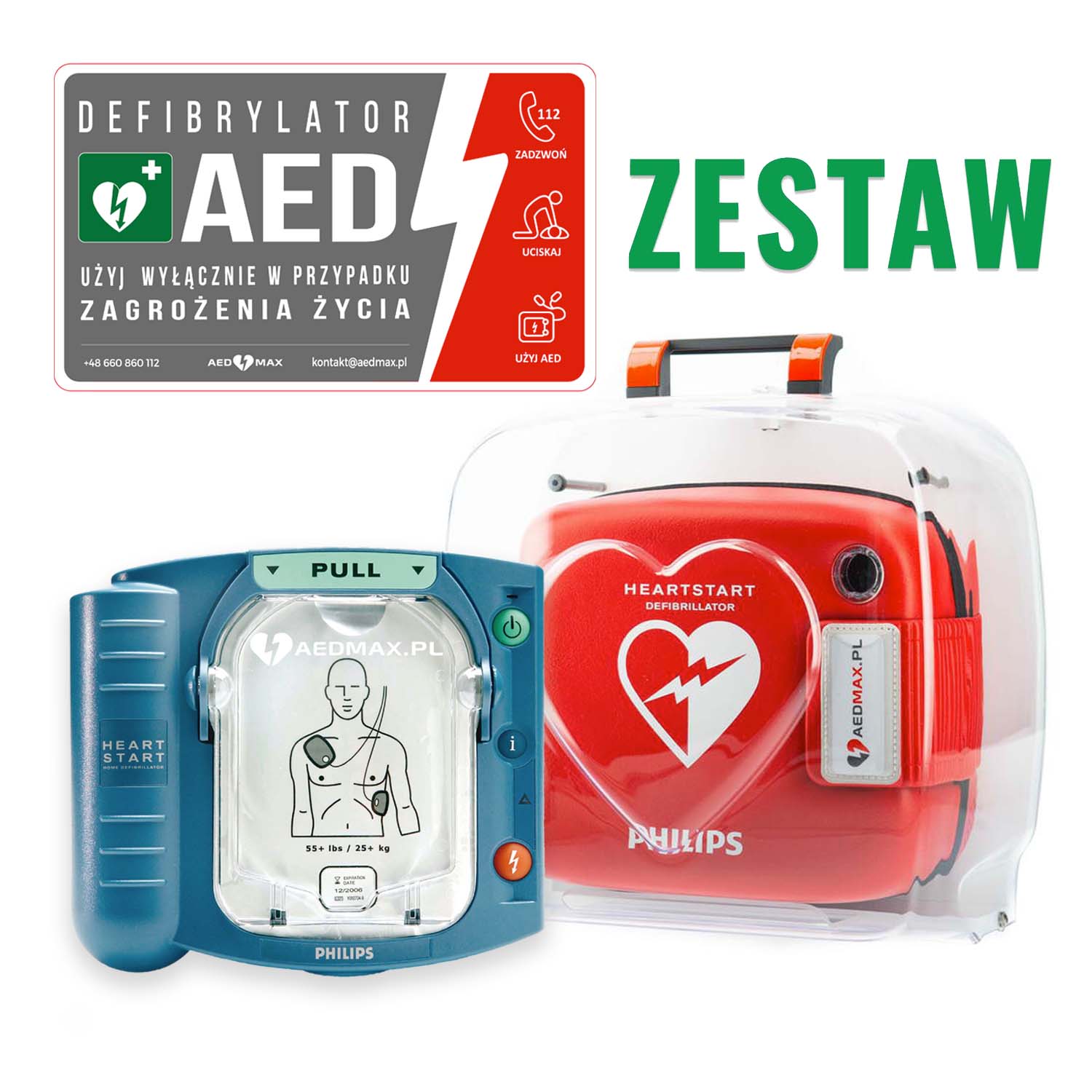 ZESTAW: Defibrylator AED Philips HS1 Slim + Gablota AED Quick do FRx/HS1 + Tablica AED wewnętrzna do gabloty